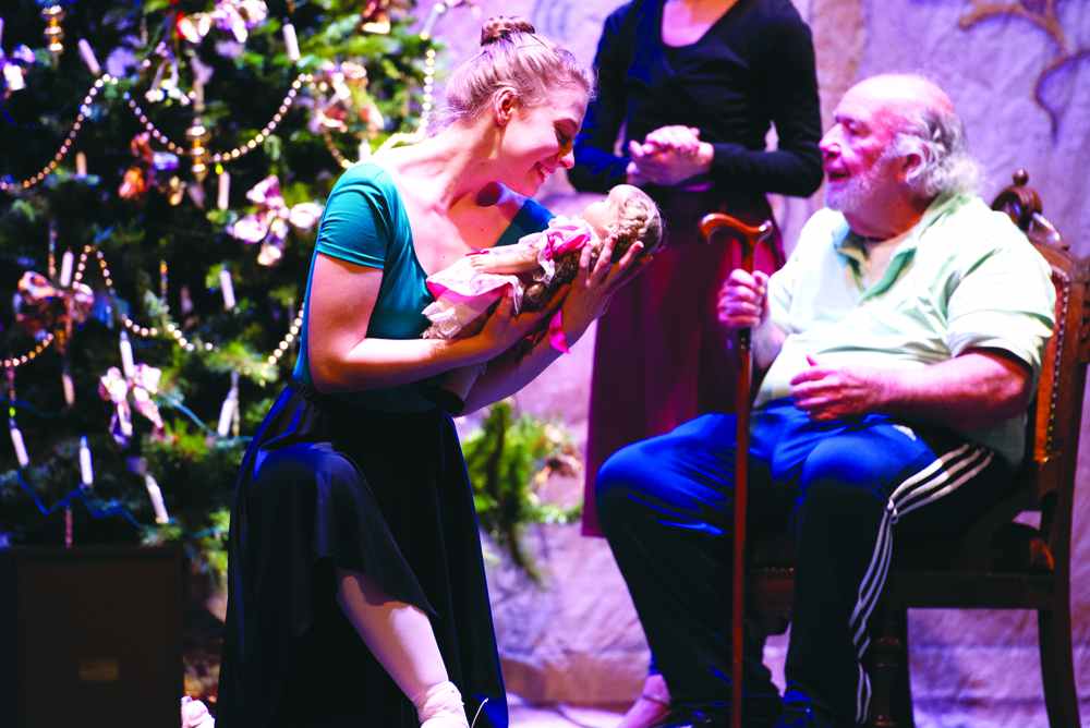 Pernille Gast, 16, Harvard has just received a doll from Drosselmeyer, as her grandfather, played by Tim Lawrence, looks on during dress rehearsal last week for "The Nutcracker."