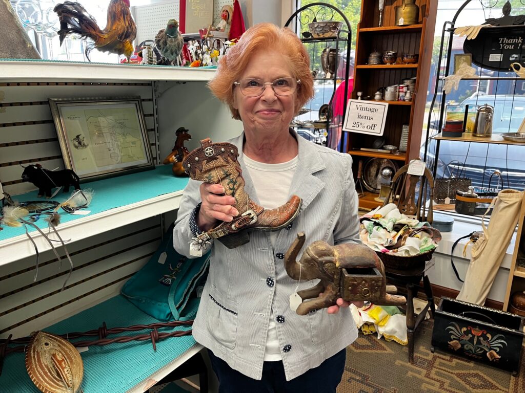 At Home of the Sparrow in Woodstock, store manager Kathleen Jaster holds up an elephant with a secret drawer and a cowboy boot wine holder, some of the wide variety of items available at the resale shop. (Independent photo by Eileen Millard)